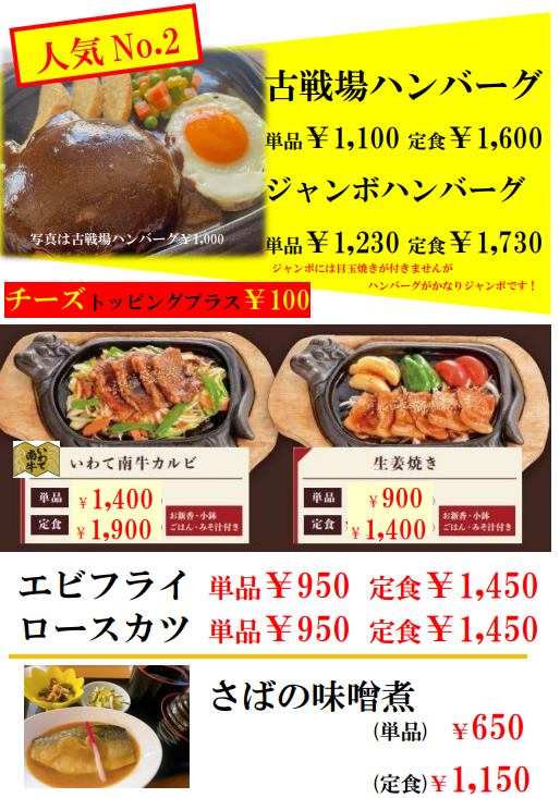 地元の食材を使ったメニューをとり揃え、特に県南のブランド牛「岩手南牛」を使ったメニューが大変人気です。